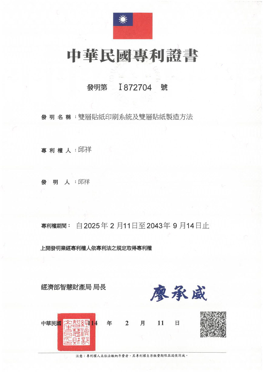 11 Feb, 2025Kang Yang Printing has been granted Patent No. I872704 for its double-layer sticker printing system and manufacturing method. This achievement highlights our strong capabilities in innovation and R&D, reinforcing our role as a market leader in delivering unique and competitive printing solutions.