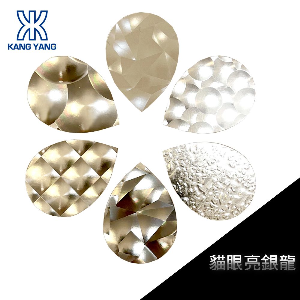 貓眼雷射貼紙採用特殊凹凸透鏡製作,具有立體的光學效果,如方格、重疊大圓、蜂巢形等多種紋理,可隨角度變化呈現深入或變形視覺。具有耐高溫、防水,防潮、抗撕裂等特性,表面可搭配亮膜或霧膜加工,進一步提升質感與保護程度。